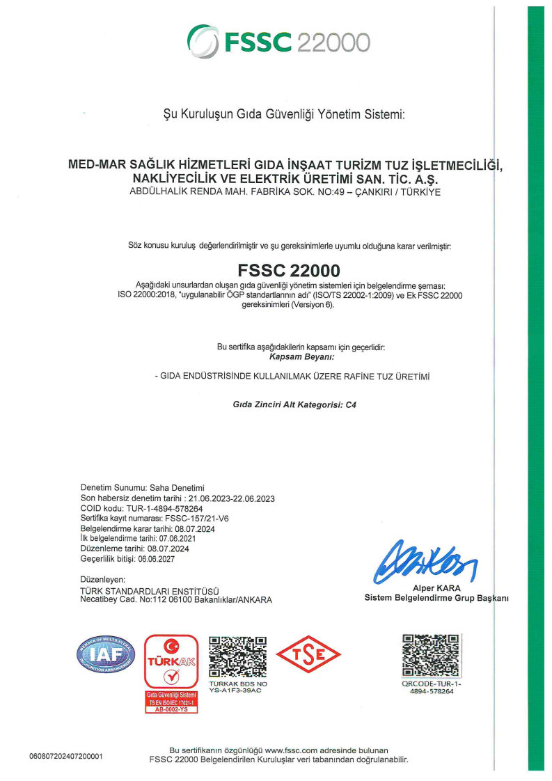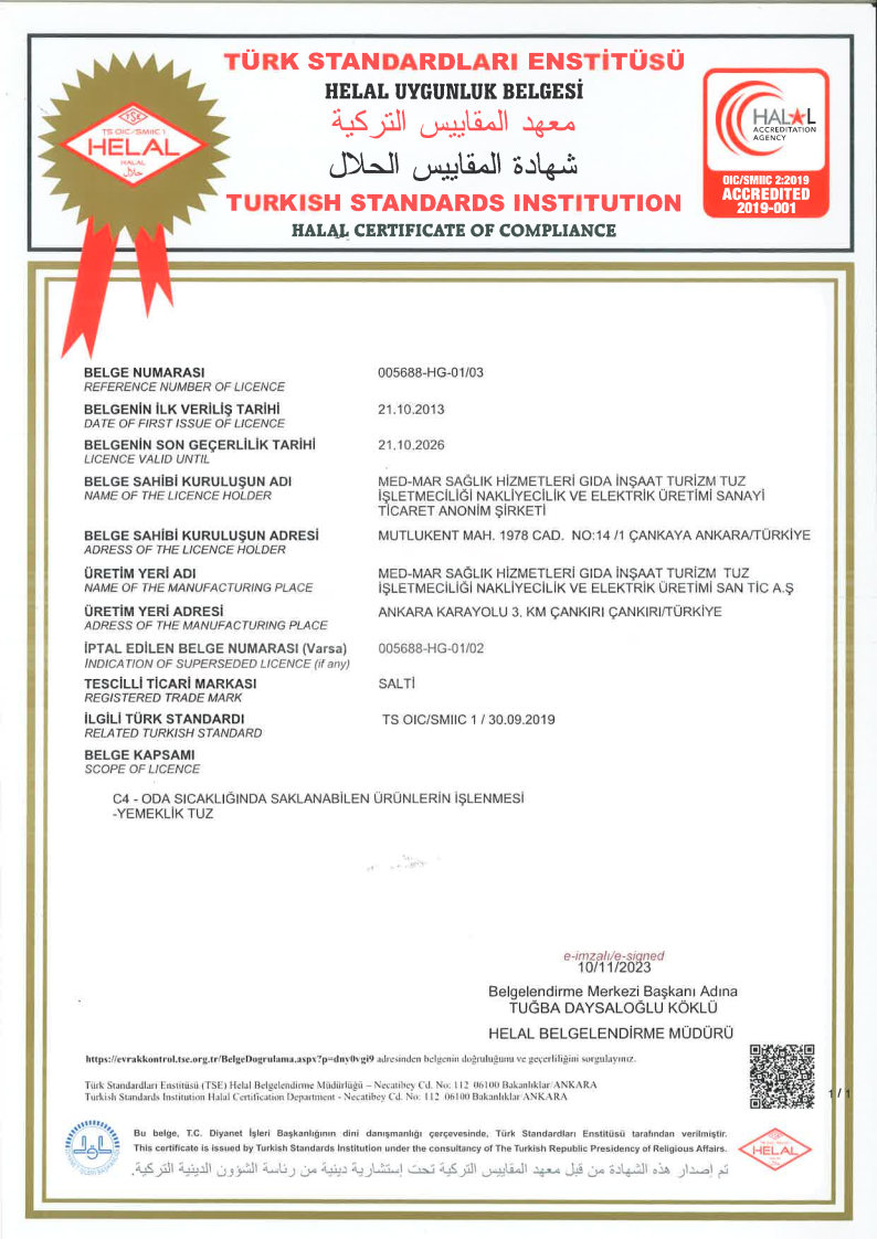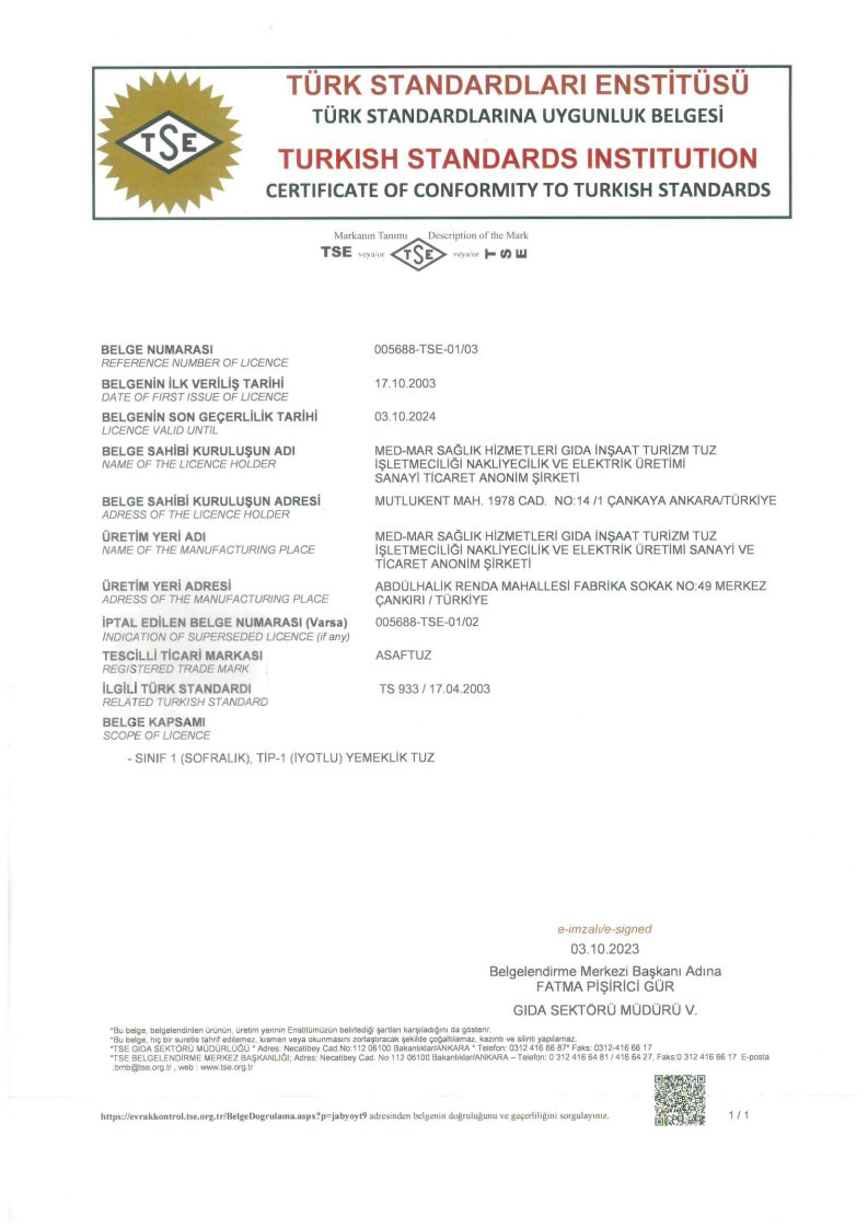 YEMEKLİK TUZ TSE BELGESİ(ASAFTUZ)