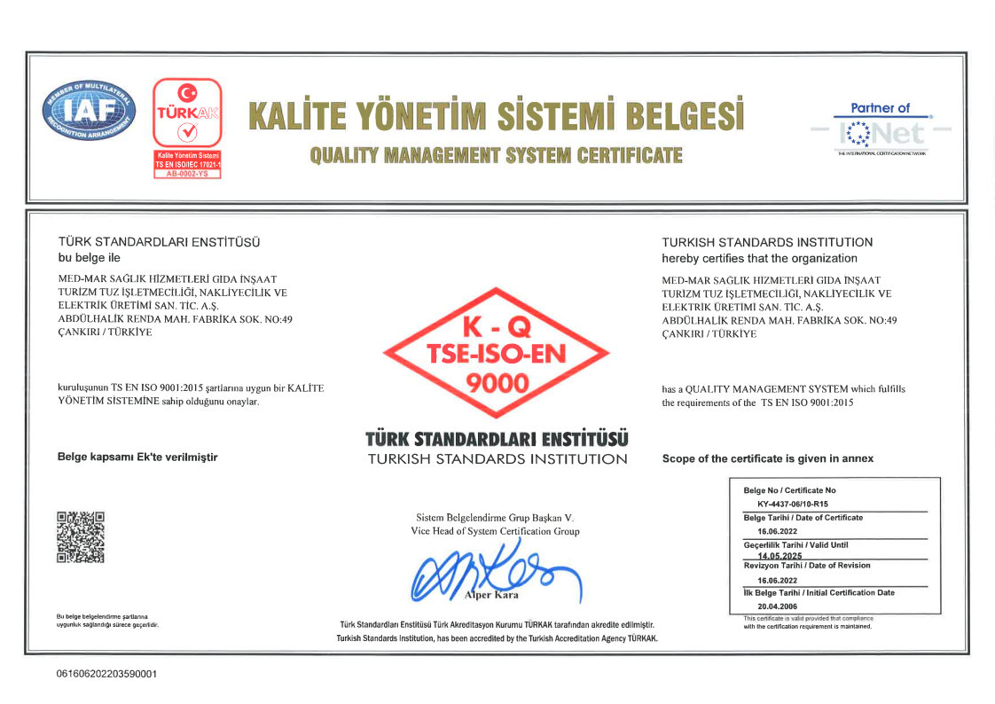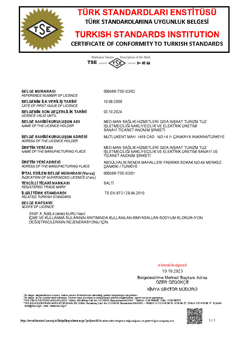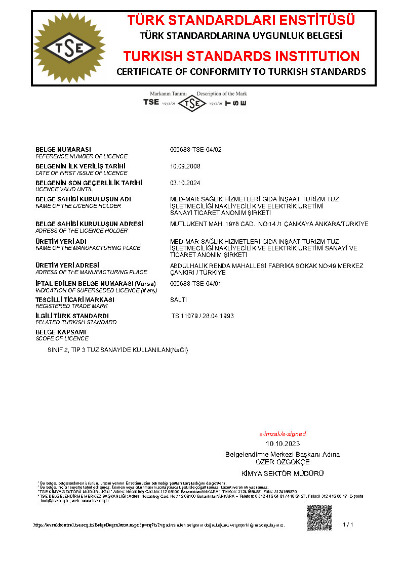 SANAYİ TUZU TSE BELGESİ
