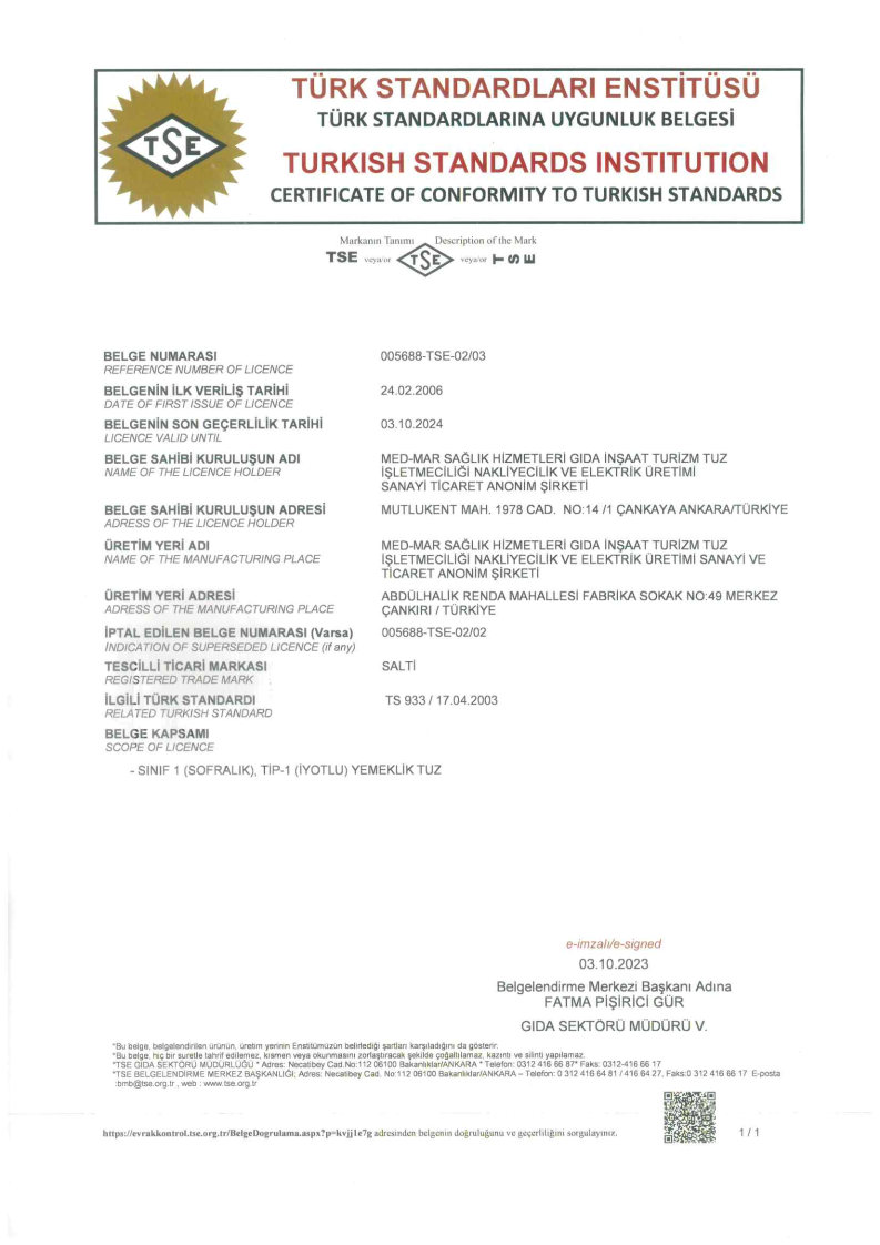 YEMEKLİK TUZ TSE 933 BELGESİ